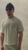 Details: Front script logo with black outline; subtle speckle effect across the body; lightly distressed, lived-in finish; ribbed crewneck and double-stitched hems.